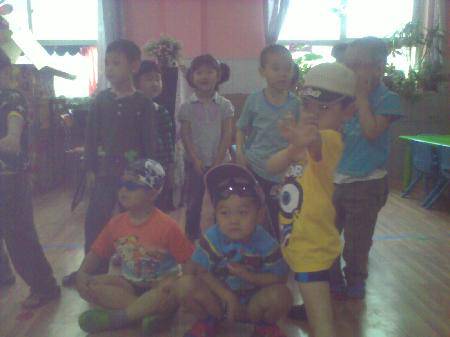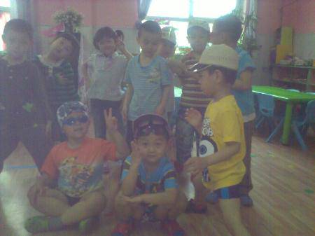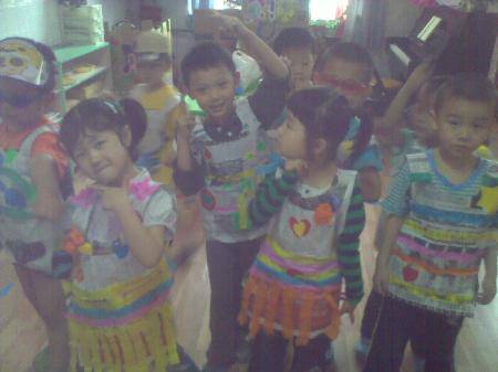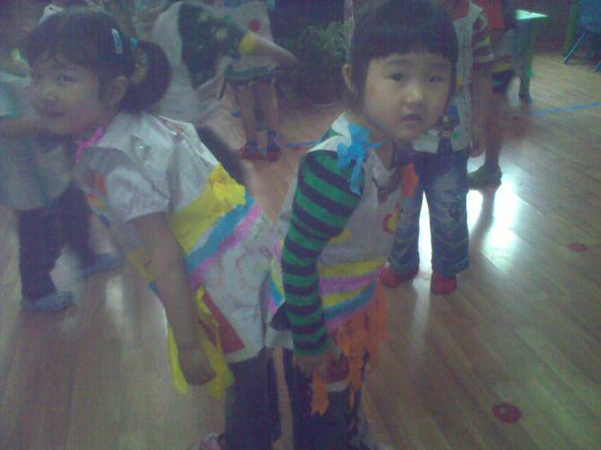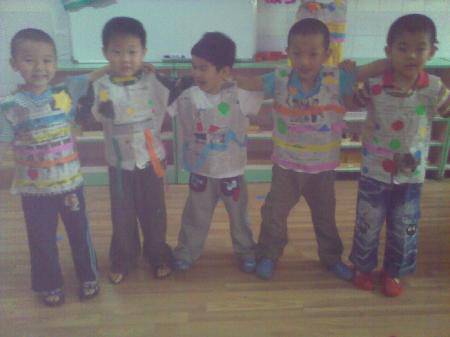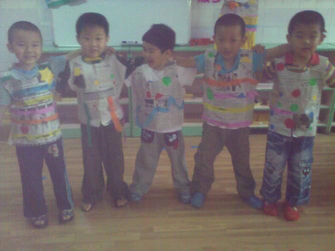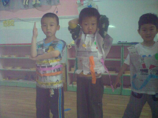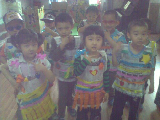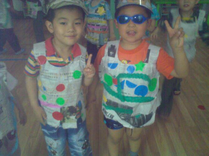 上周美工课,我们认识了夏天的衣服,又用报纸自制了服装。男孩背心,女孩短裙。在这个月“和纸玩游戏”主题中,他们真是用纸在变花样。看他们臭美的样。。。。