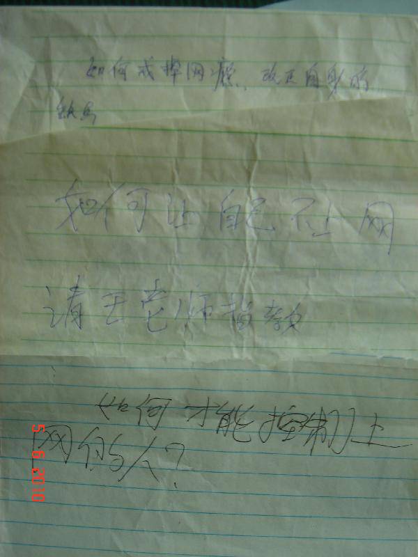 三、关于网瘾 小纸条内容:“如何戒掉网瘾,改正自身的缺点?”“如何让自己不上网?请 这里先举个例子:一位哲学家带着他的一群学生去漫游世界回来,在进城之前,哲学家指着郊外的一片草地说:现在学业就要结束了,我们的最后一课就是如何除掉这些杂草。一个弟子说:“只要有铲子就够了。”另一个说:“用火烧也是很好的一种办法。”第三个说:“撒上石灰就会除掉所有的杂草。”第四个说:“只要把根挖出来就行了。”等弟子们都讲完了,哲学家说:“课就上到这里了,你们回去后,按照各自的方法除去一片杂草,没除掉的,一年后,再来相聚。”一年后,他们都来了,不过原来相聚的地方已不再是杂草丛生,它变成了一片长满谷子的庄稼地。弟子们等待哲学家的到来,可是哲学家始终没有来。数年后,哲学家去世,弟子们在整理他的言论时,私自在书的最后补了一段话:要想除掉旷野里的杂草,方法只有一种,那就是在上面种上庄稼。同样,要想让灵魂无纷扰,唯一的方法就是用美德去占据它。 同学们,你们明白没有?要想摆脱网瘾,方法很简单:就是用更重要的事情去占领自己的大脑!如果你能明白你现在最重要的事情是什么,而且能够立即去做,网瘾就不存在了。你试着把自己的时间表安排满,什么时间该干什么事,看看还有没有上网的时间和欲望?所以,我们不是不让自己上网玩游戏,而是要找到比上网玩游戏更重要的事去做!