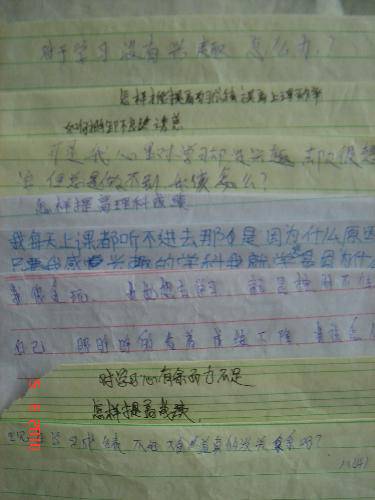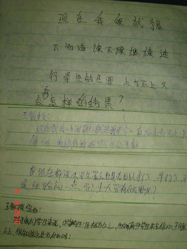 二、是否有必要继续上学 小纸条内容:“现在我很犹豫,不知道该不该继续进行学生的生涯,上与不上又会有怎样的结果?”“现在都说大学生最后也是为别人打工,早打工,不是经验高一点吗?上大学有什么用呢?”“打工然后攒钱开店找出路有前程吗?”等等。 这是受目前“读书无用论”和社会价值观混乱的影响的结果。个人认为主要原因有三:一,官员和政府的腐败让部分贪官暴富。二,不法商人和社会黑恶力量与官员相互勾结谋取大量财富而暴富。三,各类所谓的“明星”依靠走穴而暴富。四,官家和富家利用手中的权钱使其子女获得优势教育资源而上好的小学、中学、大学,进入好的单位和行业。他们的所得与他们的付出不成正比! 需要指出的是,人们更多的是看到了他们的风光,而没有看到他们可悲的下场。贪官、不法商人、黑恶势力们,被枪毙的、被判刑的、致残的比比皆是。即使他们现在没有得到应有的惩罚,他们的灵魂也得不到安宁,他们的财富也并不能给他们带来荣耀和享受。有道是“货悖而入者,亦悖而出(用违背情理的手法得到的财物,也会不合情理地失去)。”金钱是一匹烈马,你没有驾驭它的能力,不是出色的骑手,就难保不从马背跌落尘埃。何况,他们的子女也是不劳而获,也是驾驭不了这匹烈马的! 更为重要的是,久乱必治。那些不是依靠诚实劳动(包括脑力劳动和体力劳动)而致富的现象随着民主与法制的实施,会越来越少,像钱学森、袁隆平这样依靠劳动而致富的会越来越多。价值观摆正了,就不会寄希望于一夜暴富了。 再说上学。一般来说,拿到了初中、高中、专科、本科、研究生文凭,就意味着你接受了相应的教育,获得了相应的知识和能力,能够胜任相应的工作。社会的分工是不同的。学历不同,社会分工的层次也就不一样。比如说,同样是教书,博士可以到高校教学,研究生到专科和高中学校教学,本科对应于高中和初中,专科你就只能到小学和幼儿园教学了。同样是打工,也有白领和蓝领之分。你学历高、能力强,可以成为白领,搞管理,工作轻松而待遇较高;你学历低,就只能成为蓝领,工作辛苦而待遇较差。虽然也有反过来的,但毕竟是少数。何况,如果你有高学历而就了低职位,只要你能力强,工作就轻松,工作效率就高,也更容易出成绩;如果你学历低而就了高职位,你工作压力大,并且还得补学才能胜任。这里再举个例子:德 所以,我认为,努力学习获取高学历,不能说是唯一的选择,却是最好的选择。你学历高了,知识丰富了,能力强了,就业起点就高了。请记住,起点决定终点,眼界决定境界,思路决定出路。