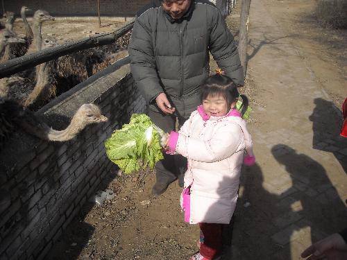 优优自己拿着白菜喂鸵鸟,哈哈!